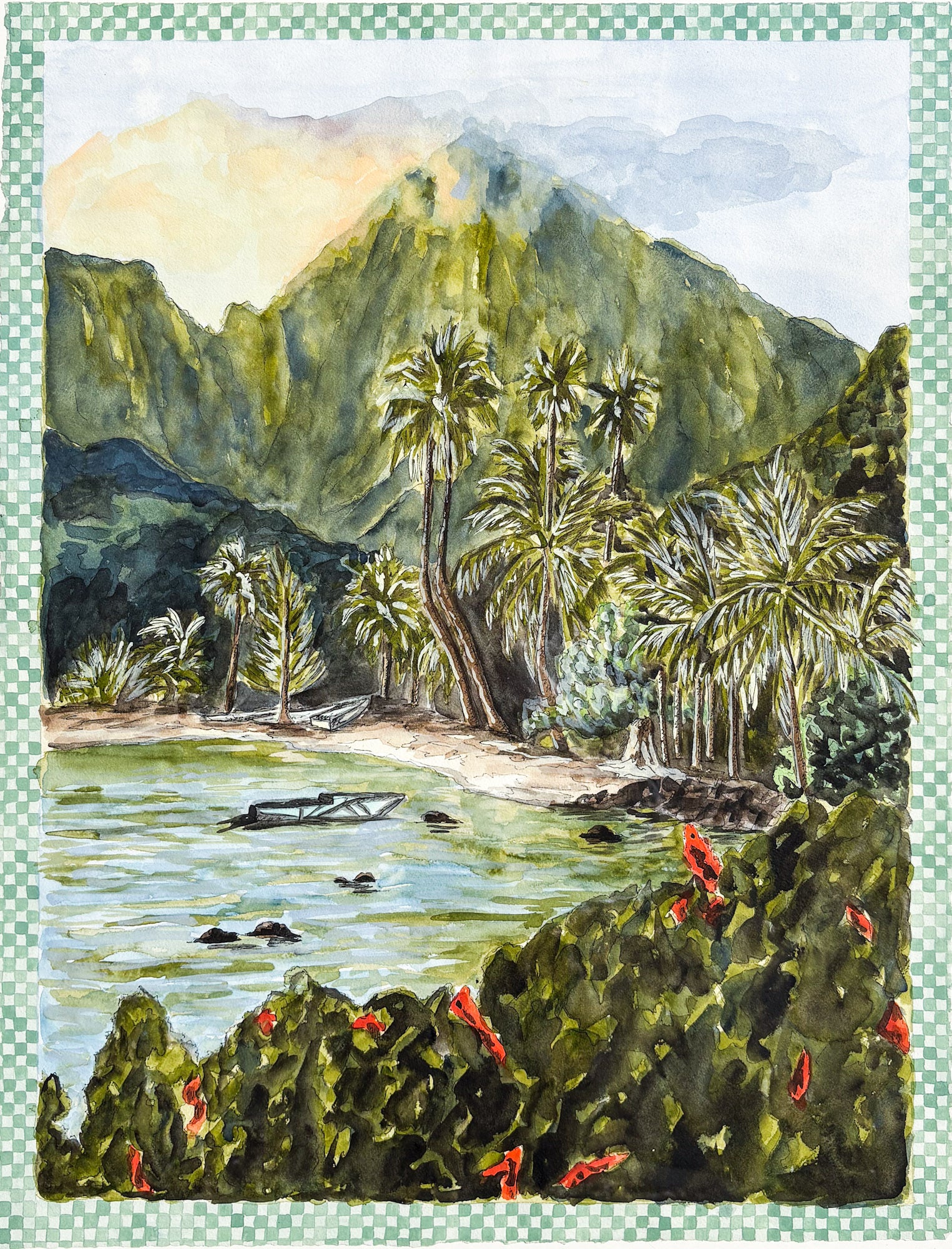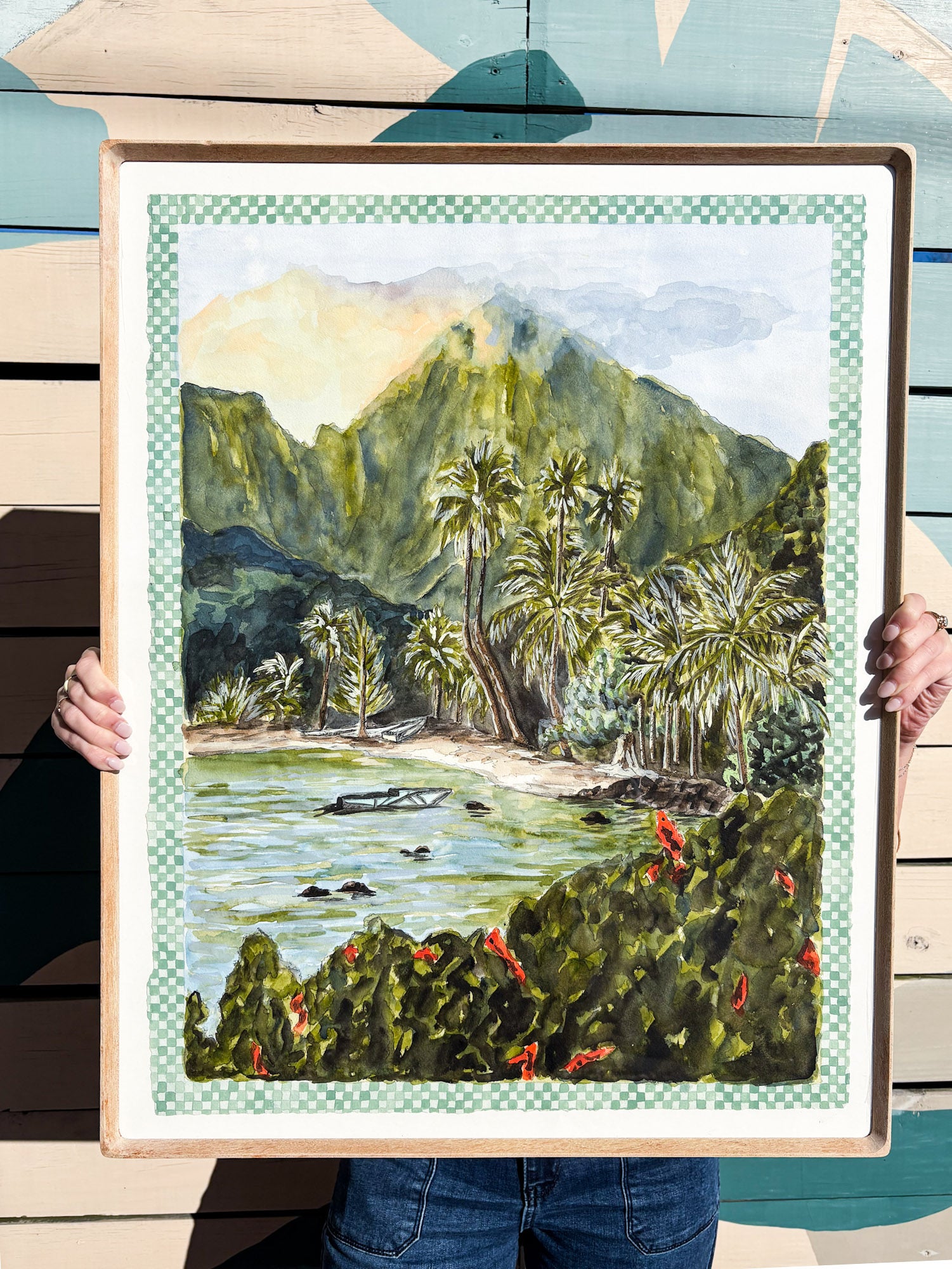 Original watercolor and ink on cold press hand torn 21 x 27 inch paper with 22 x 28 inch bleached teak wood frame, 2025.