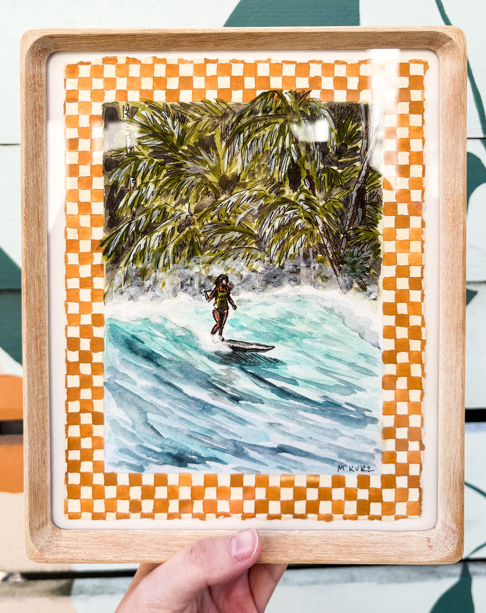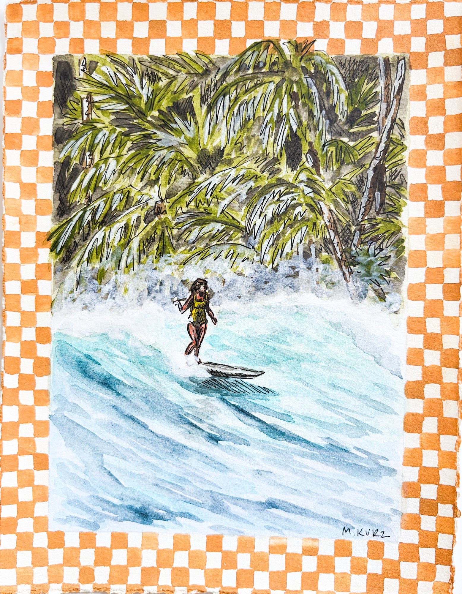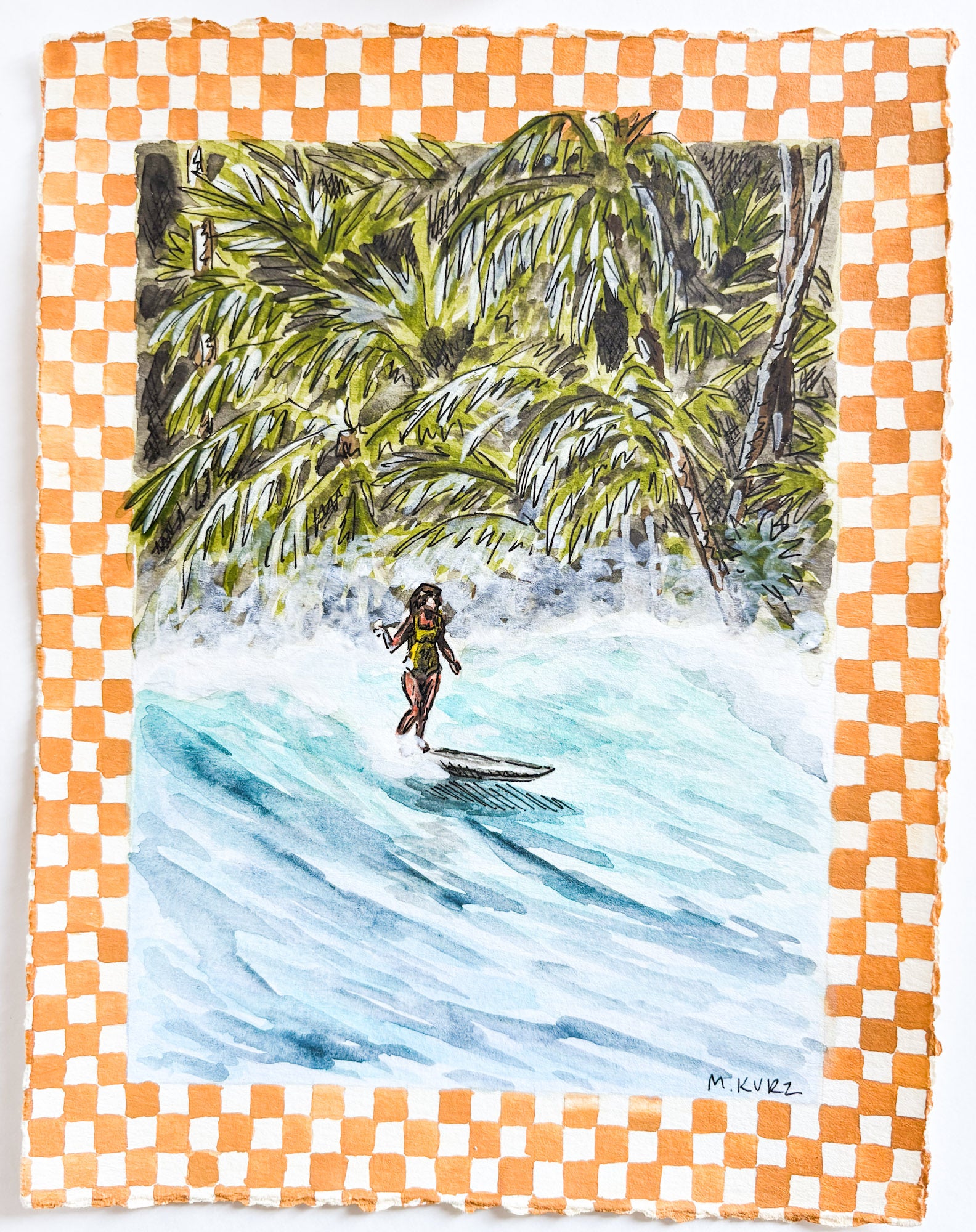 Original watercolor and ink on cold press hand torn 7 x 9 inch paper with 8 x 10 inch bleached teak wood frame, 2025.