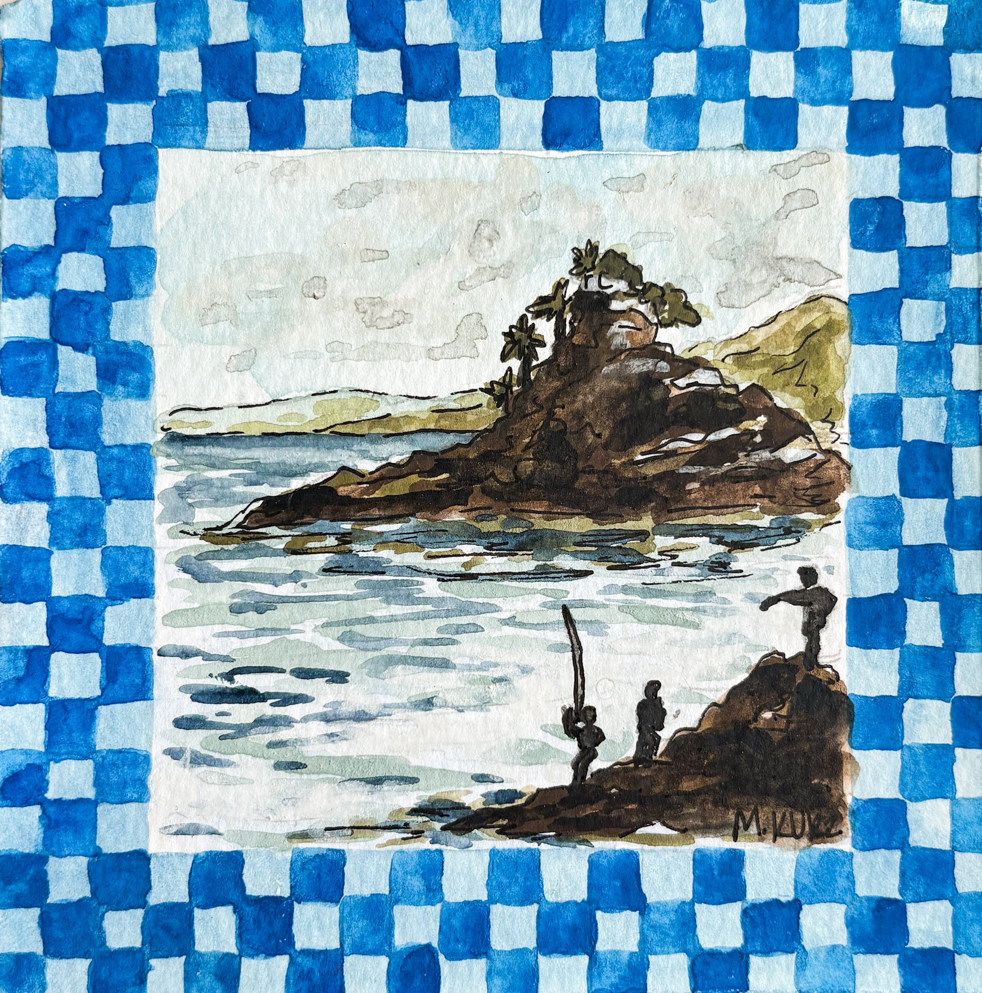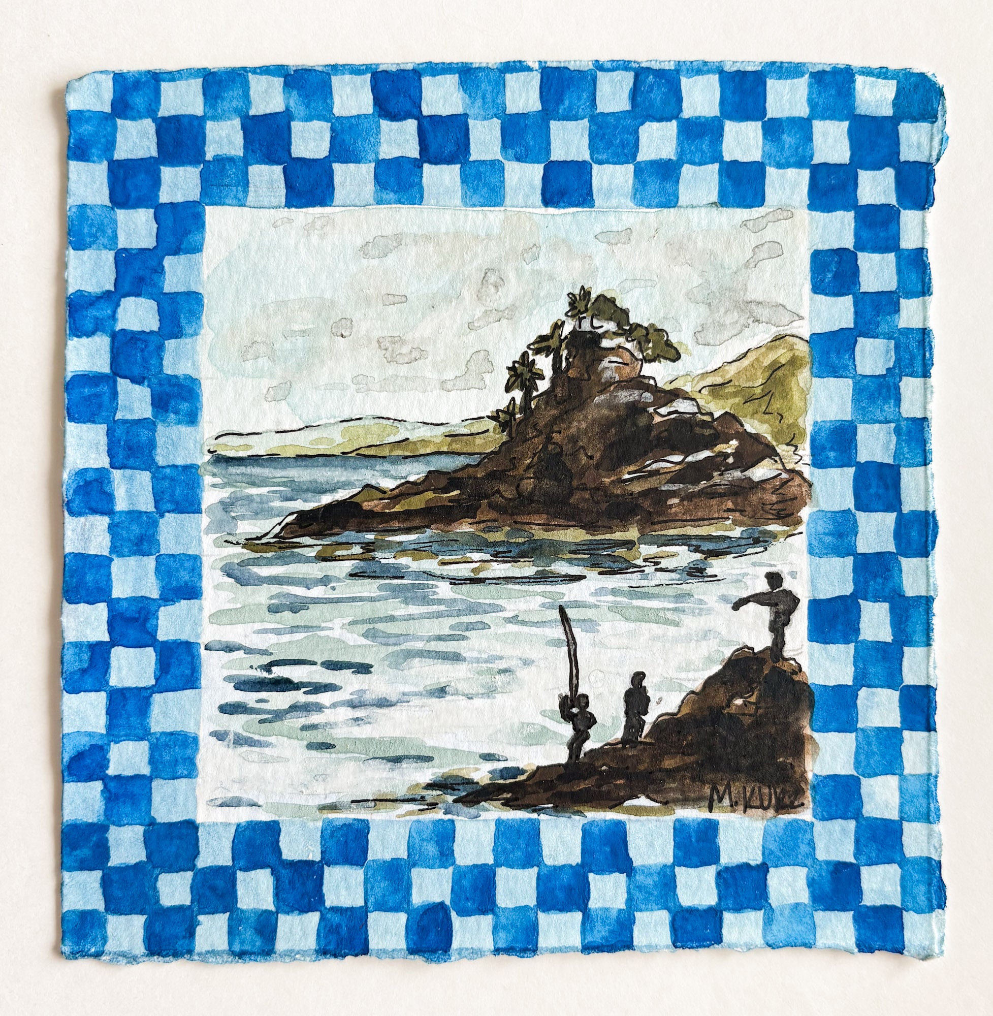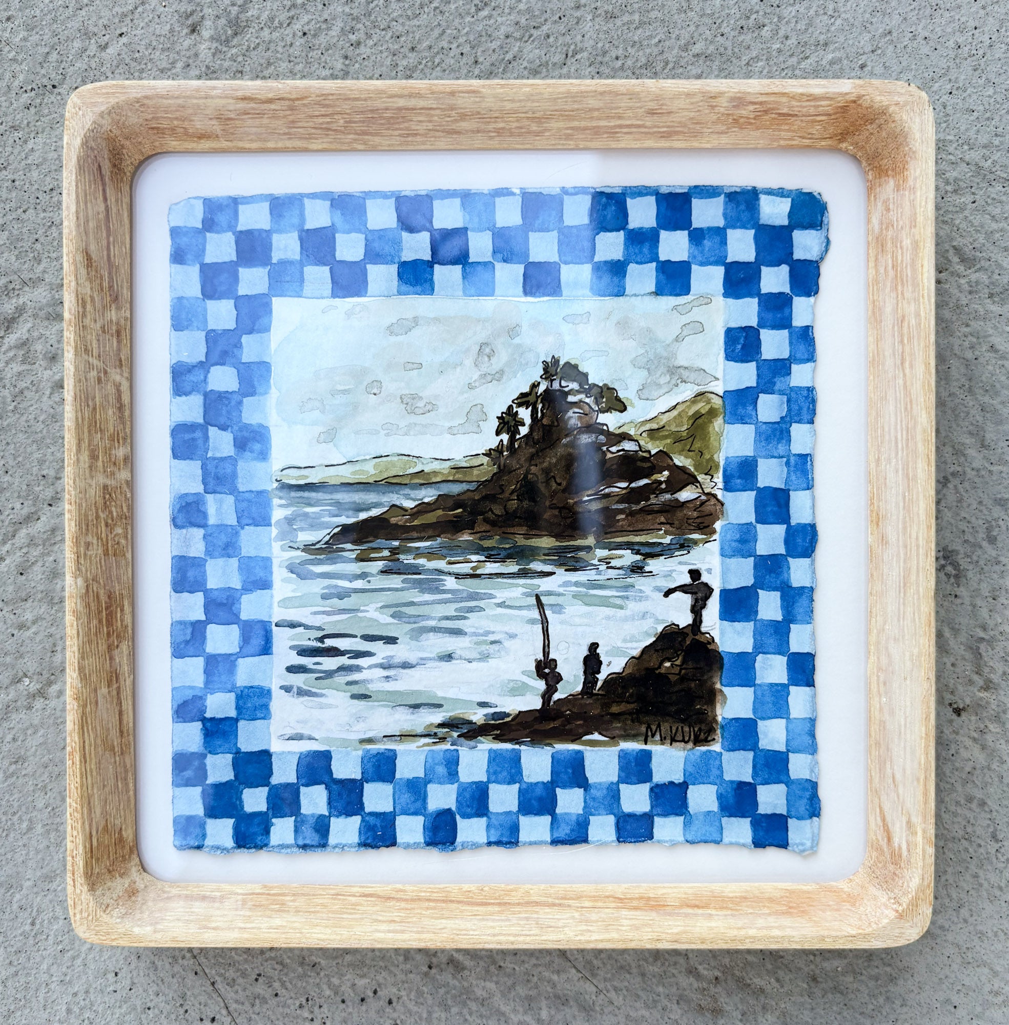 Original watercolor and ink on cold press hand torn 5 x 5 inch paper with 6 x 6 inch hand bleached teak wood frame, 2025.