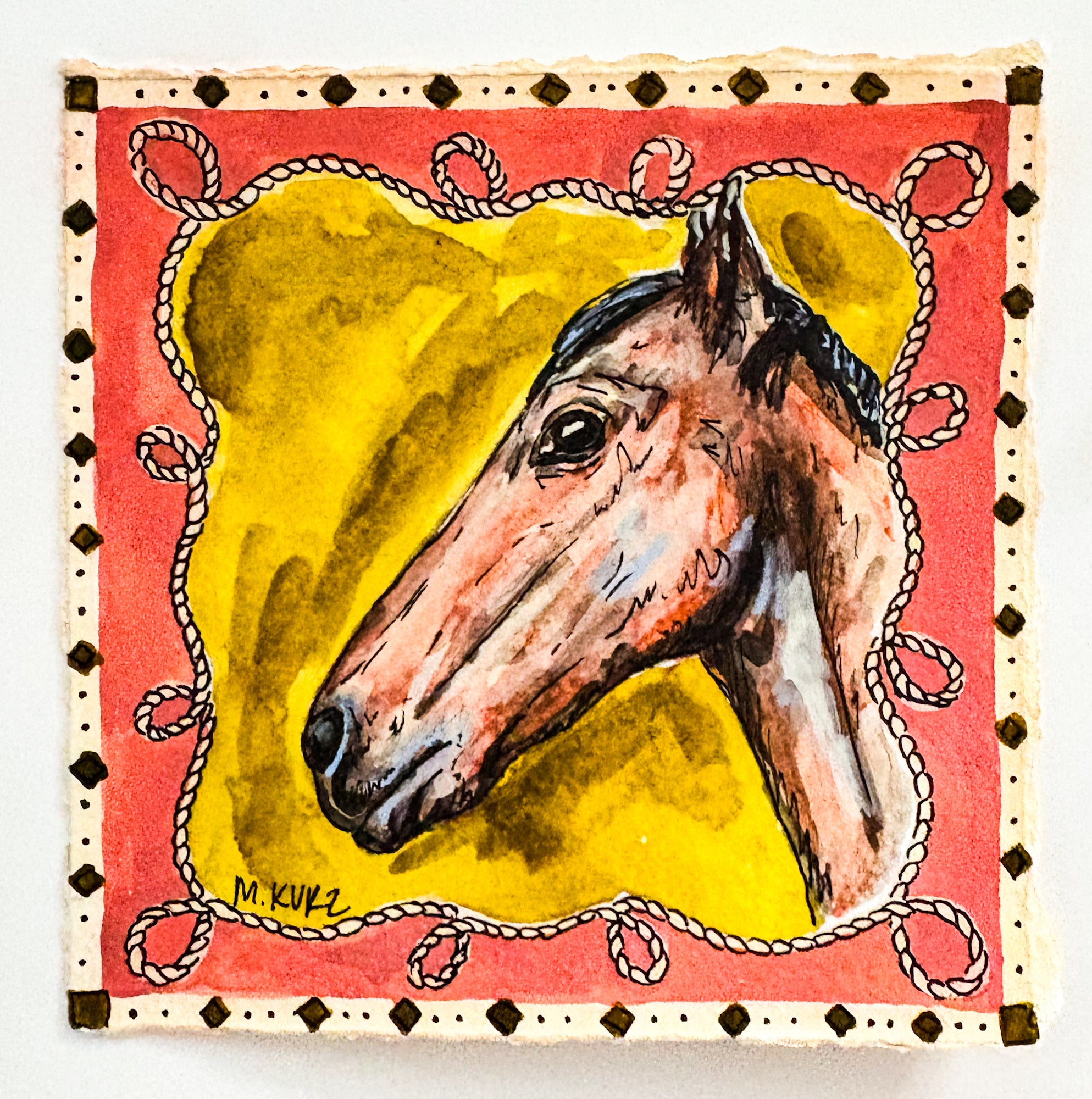 Original watercolor and ink on cold press hand torn 5 x 5 inch paper with 6 x 6 inch bleached teak wood frame, 2025.